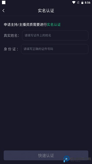 4、实名认证完成后系统会提示用户是否申请主持/主播资质,只有获得了该资质的用户才可以在平台上开聊天房
