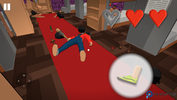 3、探寻下一个房间找到拿着棍棒的混混,用你愤怒的脚踹死他。