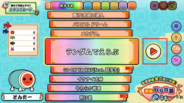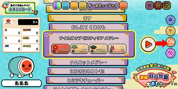 7、如果想要切换太鼓敲击音色,那么在选择歌曲界面,点击右方第三个按钮即可进入太鼓音乐设置界面