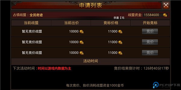 3、城战申请方法:活动城战申请,战盟盟主点击人物头像,在游戏界面上当找到战盟,从战盟点击进入战盟活动→罗兰城战,右下角城战申请,进入点击竞价申请城战,竞技城战有限制时间,关注一下申请列表的右下角的竞价结束倒计时,请在竞价结束前完成竞价。