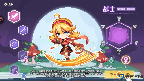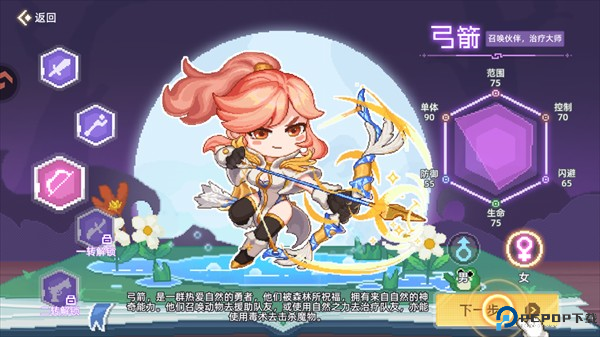 弓箭,是一群热爱自然的勇者,他们被森林所祝福,拥有来自自然的神奇能力。他们召唤动物去援助队友,或使用自然之力去治疗队友,亦能使用毒术去击杀魔物。