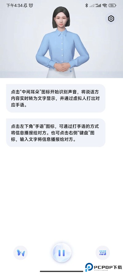 4、点击下面的耳朵图标还能识别语音,用户只需讲出自己需要翻译的句子,上方的虚拟人物就会实时打出相应手语