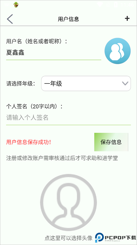 2、在“用户信息”中,可以输入用户的名字、选择年级以及上传头像,之后点击“保存信息”。