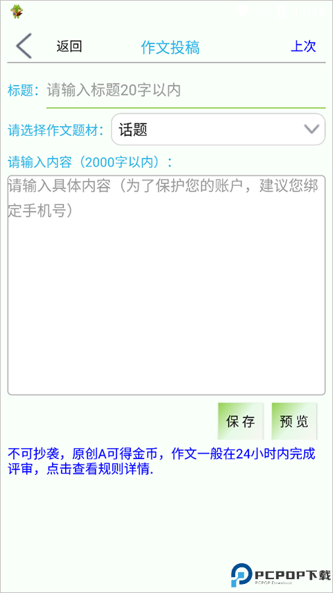 4、在“作文投稿”页面可以开始你的写作了,完成之后点击“保存”即可,然后只需要等待评审就好了。