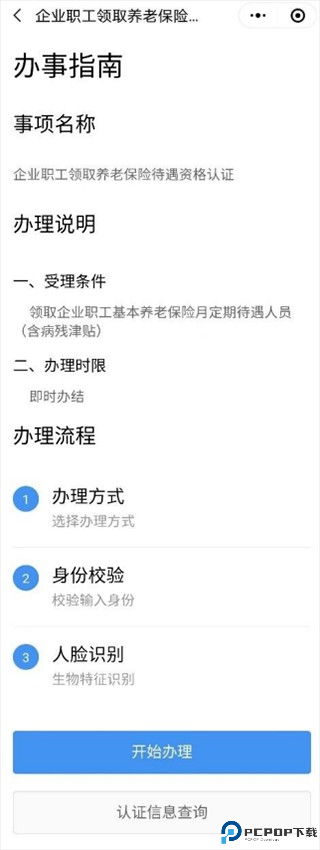 4、选择【企业职工领取养老保险待遇资格认证】功能,勾选《用户服务协议》及《隐私政策》,点击【开始办理】按钮。