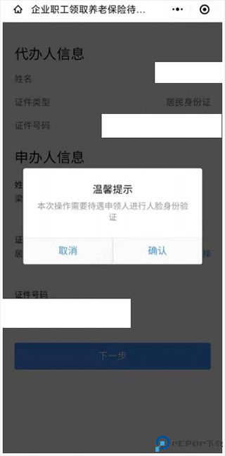 8、校验申办人是否符合条件办理企业职工领取养老保险待遇资格认证。校验通过的,弹窗提示需待遇申领人进行人脸身份验证,点击【确定】按钮进入人脸身份验证环节。