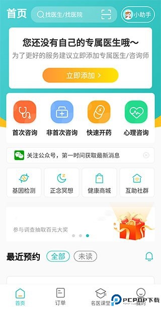 1、首先我们在本站下载安装并打开这款软件,完成注册登录的操作后会来到首页,这里为我们展示的是心理咨询和快速开药服务,点击下方的基因检测、正念冥想、健康商城和互助社群按钮也会跳转至相应的小程序中完成进一步操作,下方也有显示最近预约的提醒;