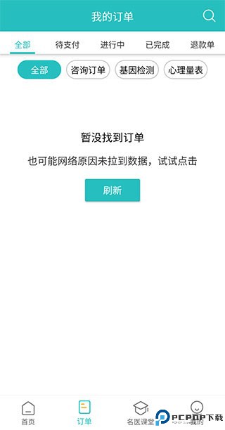2、在订单页面,我们可以看到自己所有的订单信息,其中包括了咨询订单、基因检测、心理量表和药品订单等,上方还有待支付、进行中、已完成和退款单等分类和右上角的搜索图标,这些都可以方便我们进行快速查找;