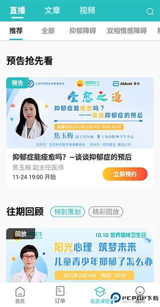 3、在名医课堂页面,我们可以看到软件为大家推荐的一些直播、文章和视频等内容,这些内容均是由入驻医师发布的,其中不乏有全国各大知名医院的医师;我们可以对即将到来的直播进行预约,也可以对往期直播进行回放;