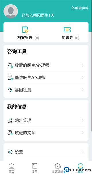4、最后是我的页面,这里一般是我们用来查看自身信息或者对软件进行一些相关的设置的,其中可以编辑我们的基本资料,还可以进行档案管理、查看优惠券、以及查看收藏的和随访的医生/心理师,还可对收货地址进行管理。