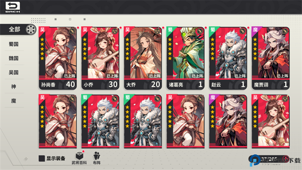 武将分为三个国家、四种职业的武将,不同武将有其对应技能。武将有升级、升星、装备、军魂、无双突破这些类型培养。武将之间有相应羁绊,一起上阵可发挥最大作用。