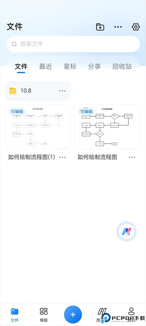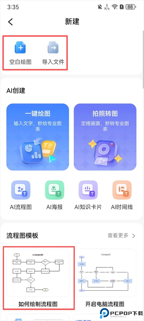 1、打开万兴图示APP,在首页点击新建,可创建空白绘图或从本地导入文件,也可在下方选择模板应用;