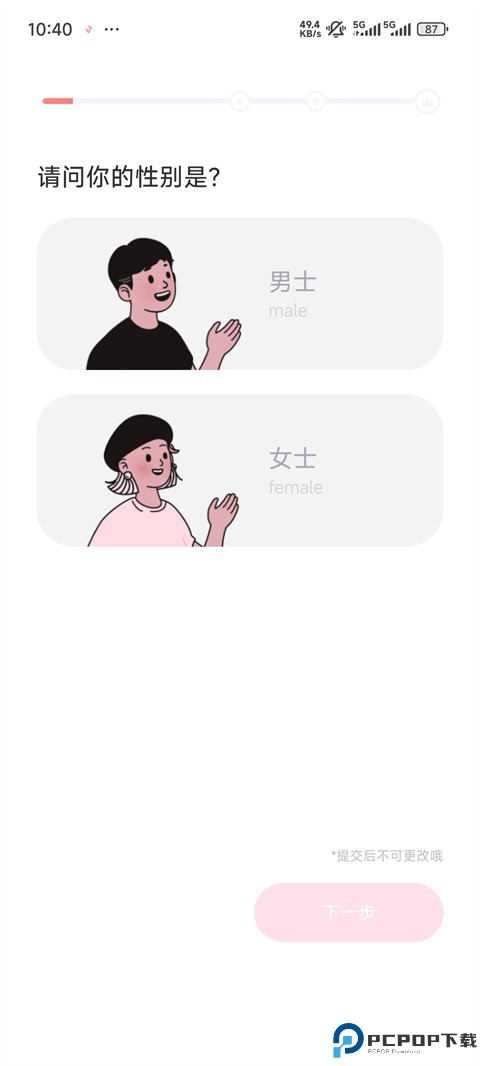 1、打开软件选择性别,完成各种信息提交后就不能修改了