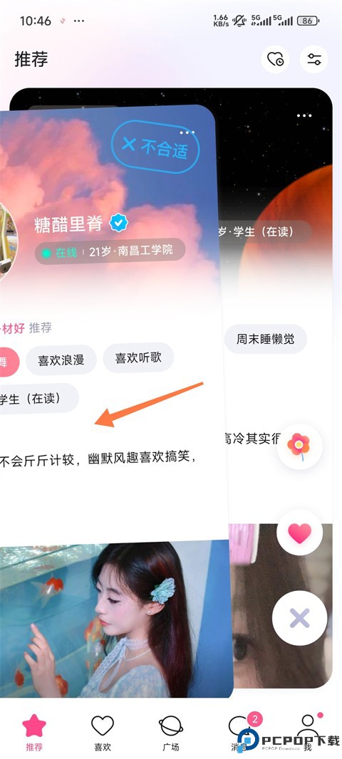 3、进入软件后可以在主页看到一些信息,【左滑代表不合格就是不喜欢的意思】
