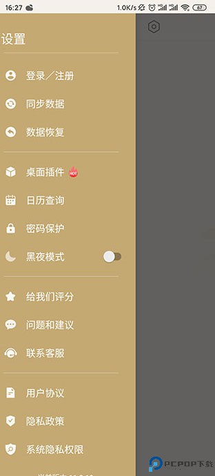 2、点击左上角的符号能够打来设置功能,其中有着登入注册、同步数据、卓面插件、日历查询、密码保护、黑夜模式等工具。