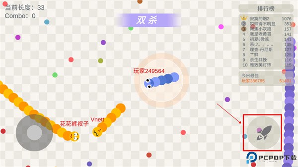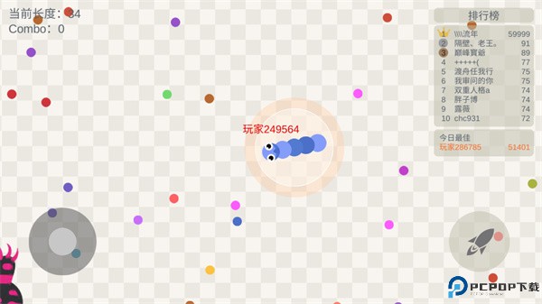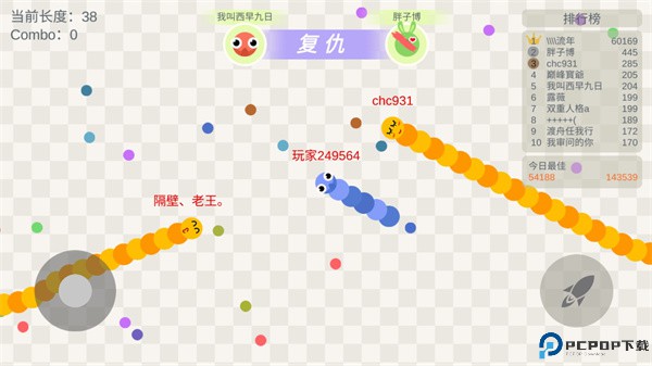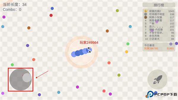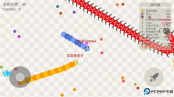 2、拖动摇杆控制小蛇的方向,吃掉地图上彩色的小豆豆,不断的变长;