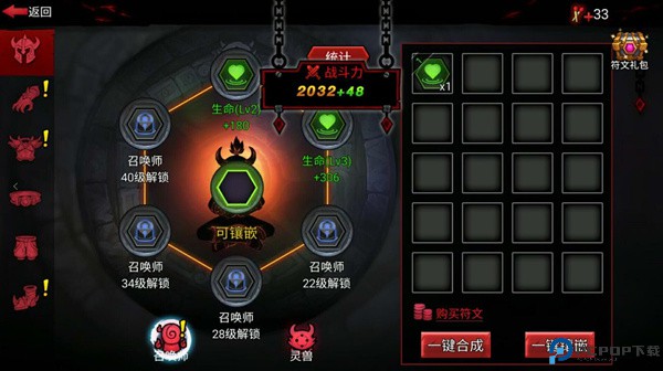 火柴人联盟2的符文系统将于通关第二章第六关后解锁开启,这个时候人物等级16级一定要去把符文搞起来才能保证后面通关的顺畅!当第一次开启符文系统时,6大装备部件均已开通第一个符文插槽分别对应生命、攻击、防御、破防、暴击、抗暴6大种类符文,每件装备中间可镶嵌特殊属性符文!(PS:人物每升级一级开启一个符文插槽)