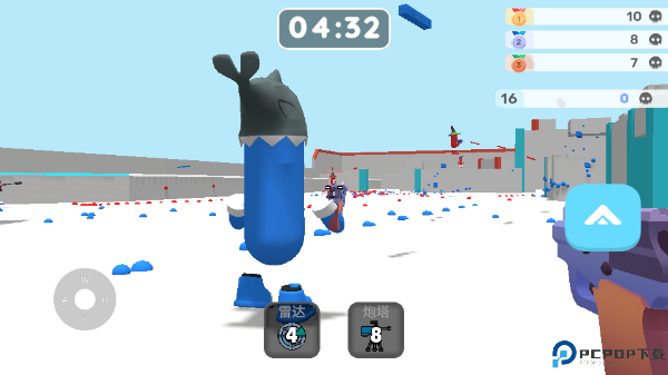3、开始游戏,左边滑动可控制方向,右边滑动可控制视角,点击右边蓝色向上的箭头可跳跃,杀死4个敌人可获得雷达,杀死8个敌人可获得炮塔。