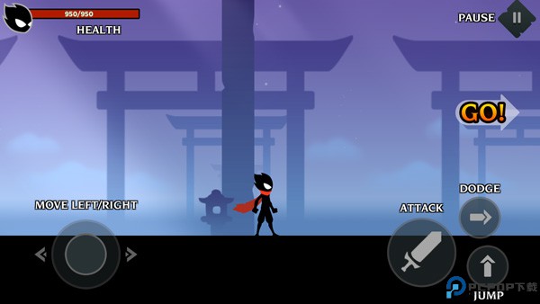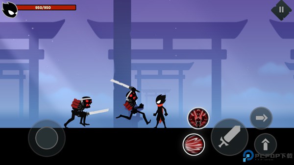 3、游戏内如图,左边控制移动,右边控制攻击、闪避、跳跃;