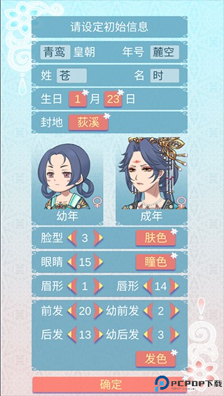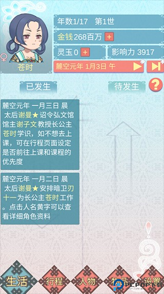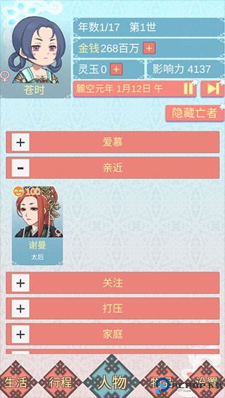 1、初始开始游戏界面选择好人物的各项属性和姓名、年号等数据。