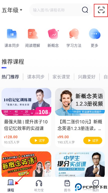 2、菜单栏点击课程,然后点击右上角扫一扫图标。