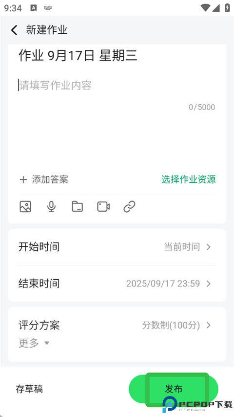 3、填写作业内容、以及开始结束时间,点击发布即可。