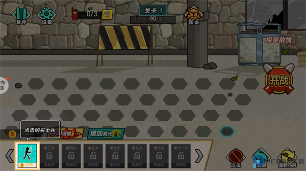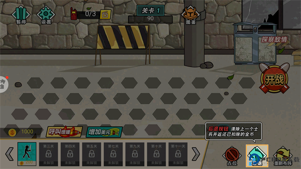 4、点击后退按钮可以清除上一个士兵并返还已扣除的金币。