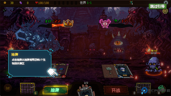 游戏开始阶段会发两张牌到手牌区,每张牌抽出时会召唤对应的生物;不同的生物都有自己的特性