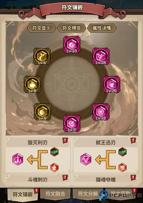 分解多余符文获取符文碎片,强化现有符文的等级。