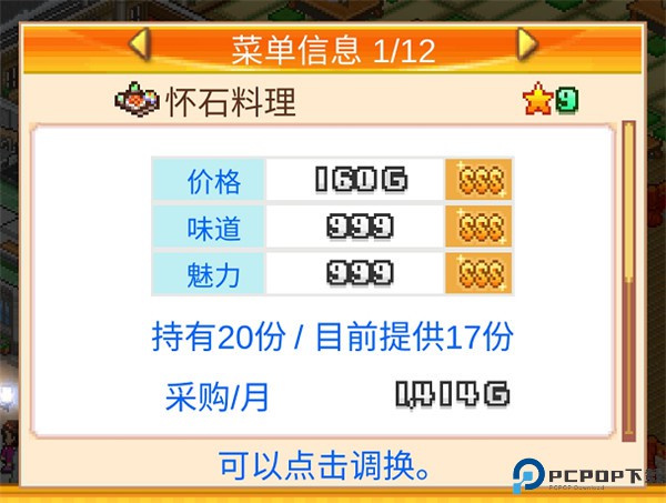 3、而菜品价格也是由八维图的数值直接决定,每个食物都有着其价格、味道、魅力上限,因此在菜品研发上,选择高上限的菜品往往会得到事半功倍的效果!