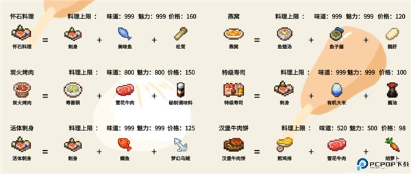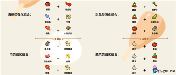 5、每种菜品根据其自身的风味以及品类,都有与之最适应的强化食材,这部分只能通过平时的日常积累自行摸索,这里只能罗列一些比较通用的以供参考