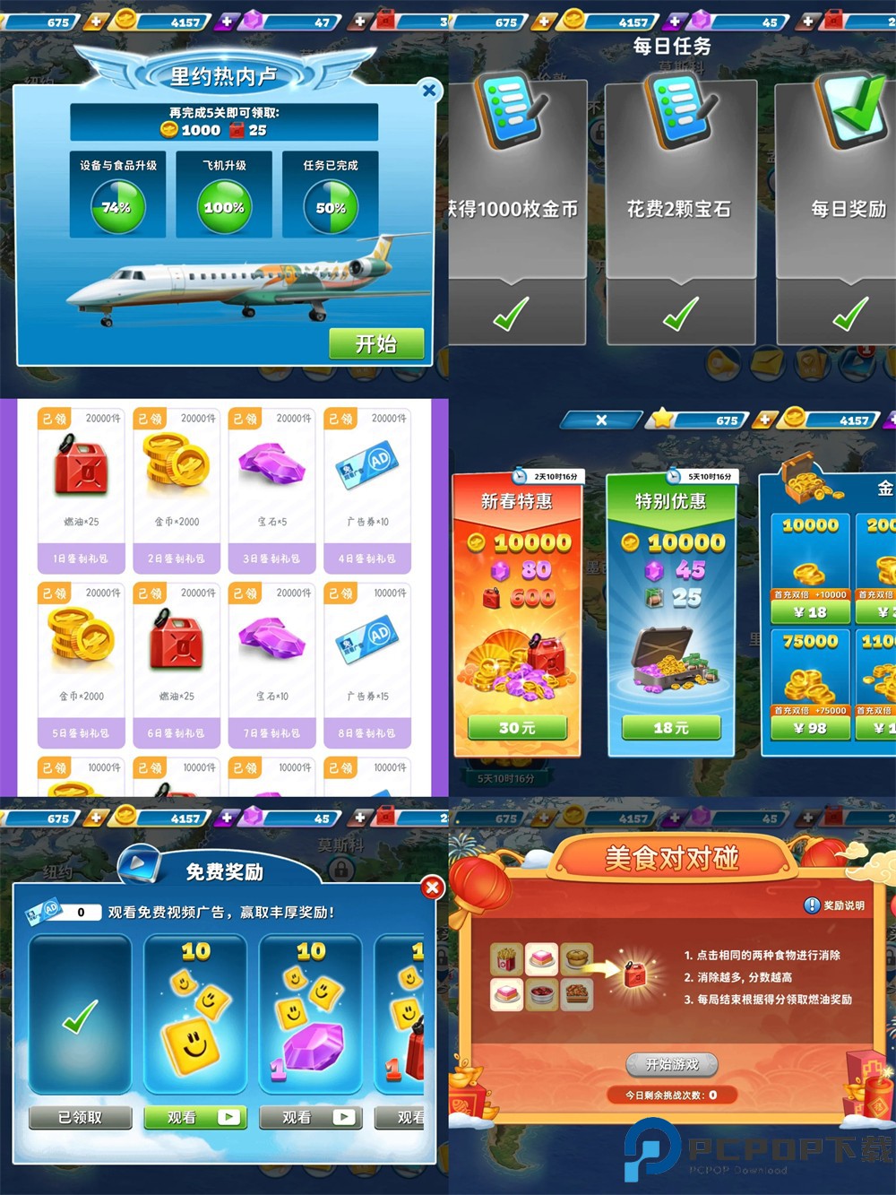 飞机大厨有一个最大的苦恼就是油不够,可以通过活动,签到,任务,看广告以及买礼包的方式获得燃油,同时每完成五个关卡,也会有相应的金币,燃油,钻石奖励。