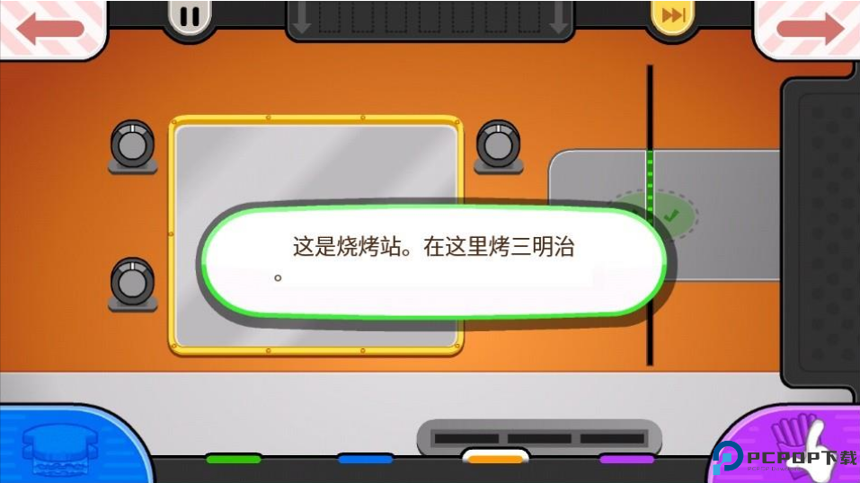 4、刚开始会有剧情介绍,点击右下角的跳过就可以啦,如图所示,这里是烧烤站,可以在此烤三明治哦