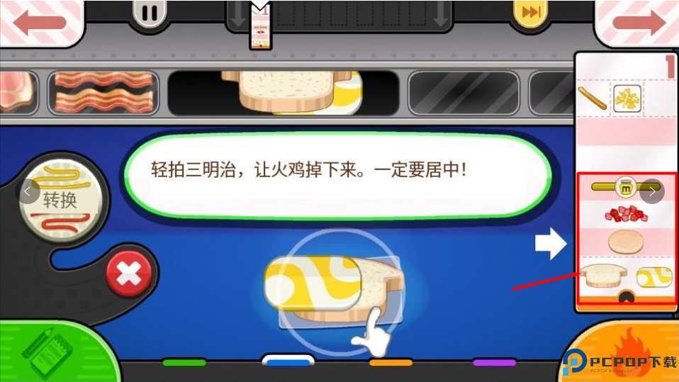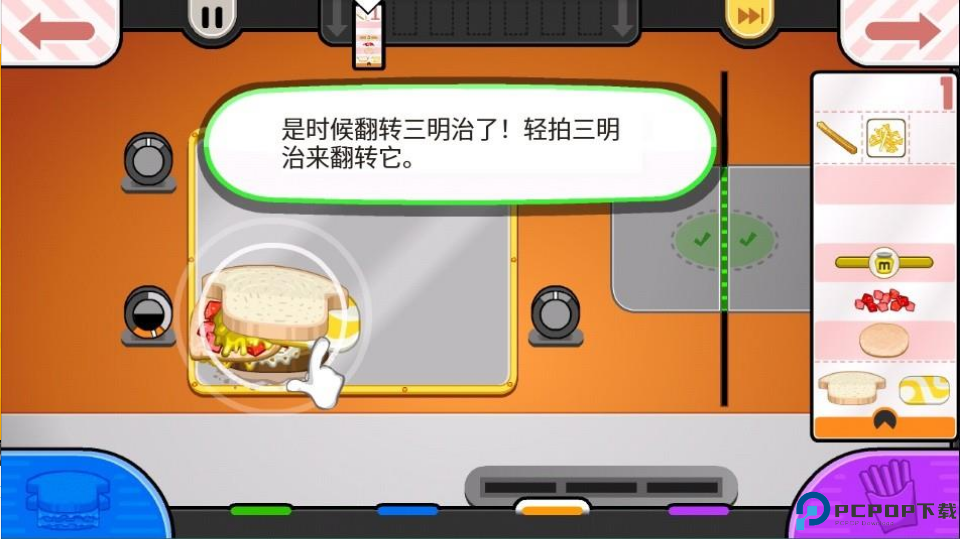 9、过程中待三明治左边的计时器出现红色警示就要轻拍三明治来翻转它,完成之后拖到右边打勾的地方就可以出炉给顾客萨沙啦!
