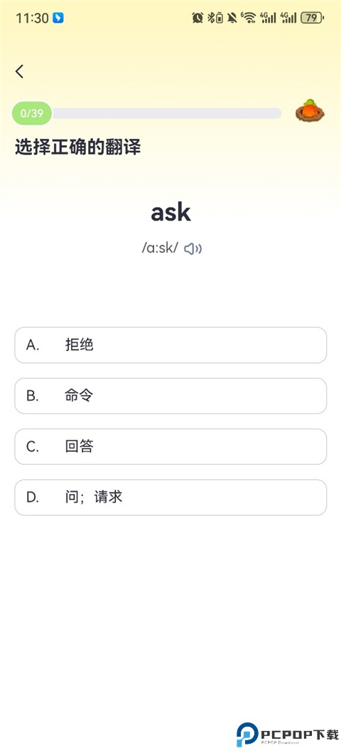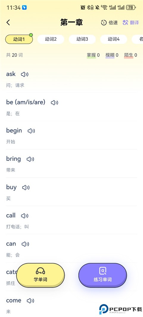 3、进入章节后可以选择不同的词语进行学习,可以进行单词播放、翻译。