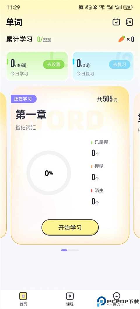 2、进入首页,提供3个章节板块以及每日学习设置。