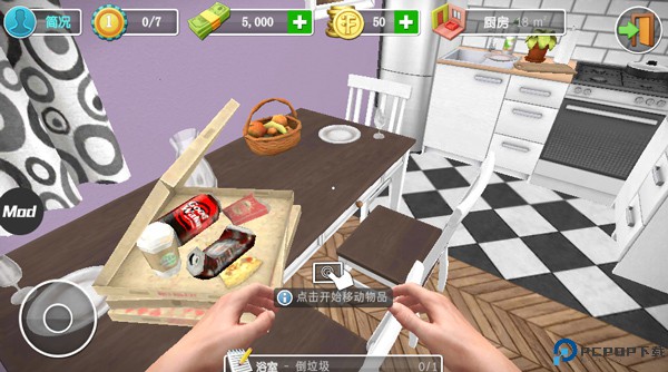 1、首先下载房产达人中文版客户端,进入游戏,默认简体中文,我们可以通过移动控制人物前往前方的房间,点击左下角的键位进行开门;