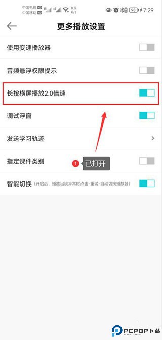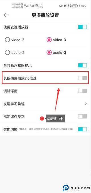 3、然后,点击打开长按横屏播放2.0倍速功能开关。