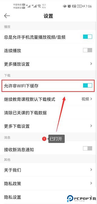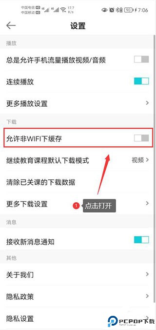 2、点击打开允许非WIFI下缓存功能开关(图片中圈红的部分)