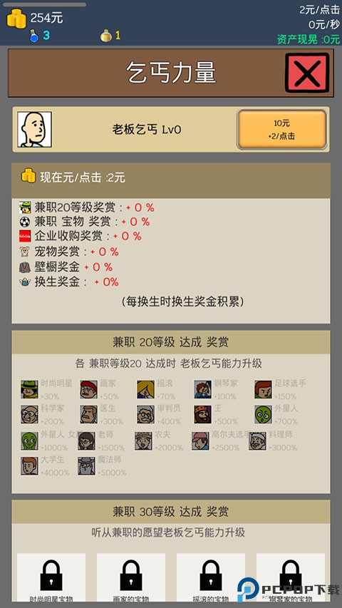 养乞丐是一款有趣的养成类游戏,将一名身无所长的小乞丐培养成商业大亨,刚开始时需要为它赚够充足的基础资金作为投资,抓住每一个机遇,不断地扩展产业。
