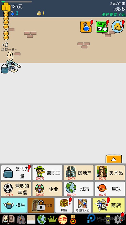 这是前期主要的资金来源,每一次点击屏幕,都会获得少量的收入。