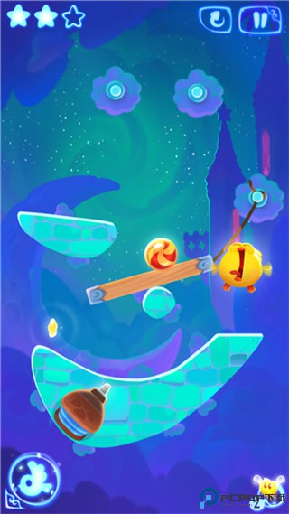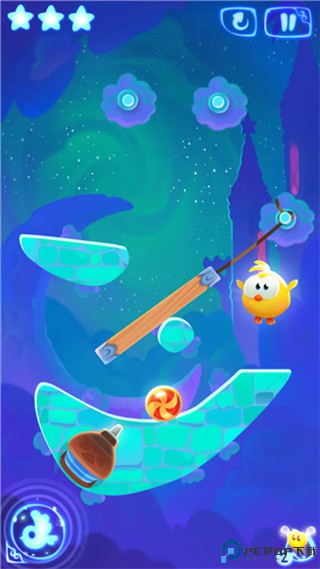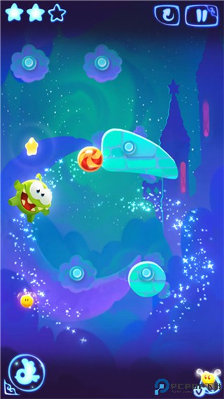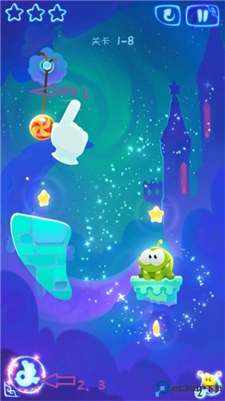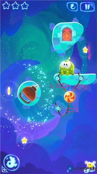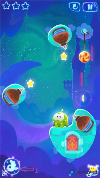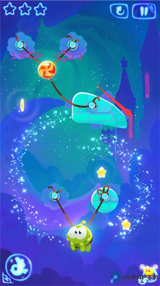 当糖果获得第一颗星星的时候将绳子割断,糖果便可顺着星河达到指定位置。
