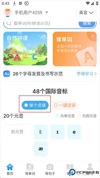 1、在软件的首页可以看到有自然拼读、背单词和48个国际音标