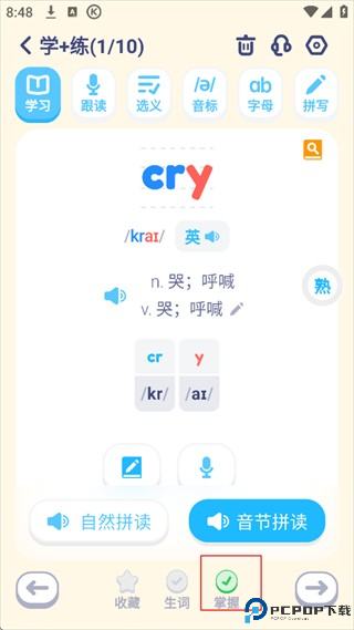 5、随后就可以开始背了,感觉掌握了这个单词就可以点击下方的掌握,进行下一个单词