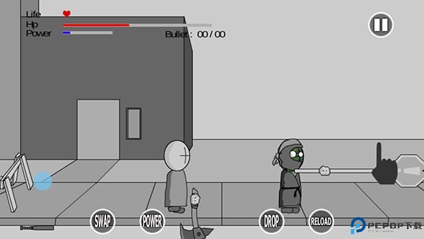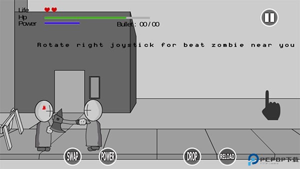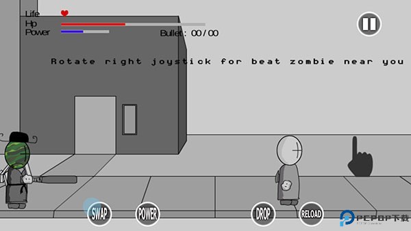 4、进入后左侧屏幕移动蓝色圆圈可以控制角色行走移动,左上角爱心是当前生命值,hp经验,power力气,需要一定时间来恢复,底部是快捷按键,比如Drop就可以释放机械手中所拾取到的武器;