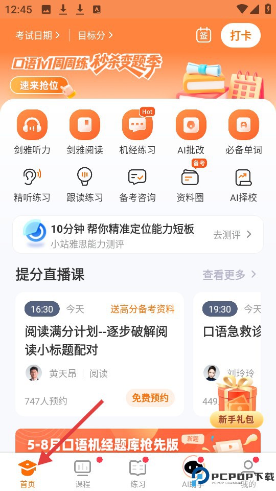1、首页可设置考试日期与目标分,含剑雅听力等多样练习入口,还有提分直播课如阅读满分计划等可预约。