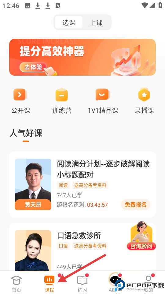 2、课程页面分选课上课,展示公开课等课型,人气好课有阅读口语课程,附名师信息与报名倒计时可免费报名。