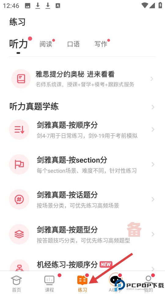3、练习页面覆盖听、读、口、写,介绍雅思提分课服务,听力真题学练按顺序、题型等分类新增机经练习板块。