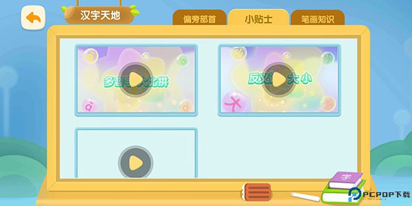 该环节通过动画指导和特效情景,教孩子如何书写汉字,具有一定的趣味性。