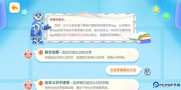 拒绝囫囵吞枣,进级式教学体系,成绩达标才能开启新学习,保证学习效果!随时了解学习效果,控制学习进度与时长,是家长最得力的识字好帮手。